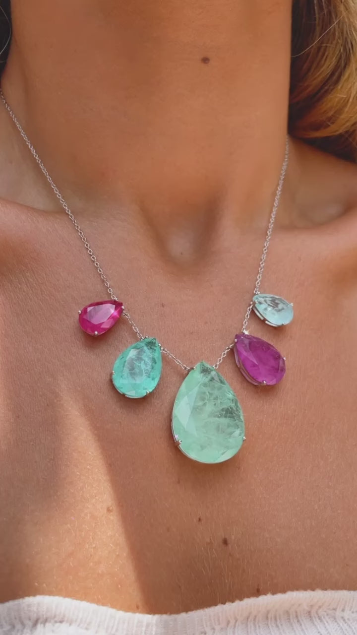 Fusion Emerald, Amethyst and Tourmaline Angelica Necklace features 5 drop-shaped stones, elegantly combining the beautiful energies of emerald, amethyst, and tourmaline. Experience a fusion of positivity, clarity, and harmony with this beautifully crafted necklace.